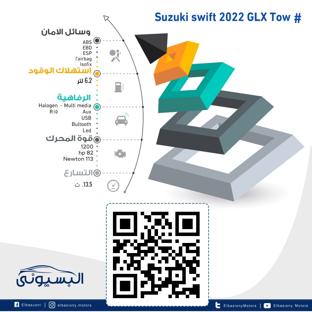 مواصفات السيارة | Suzuki swift 2022 GLX Tow Top line with Screen 5k km Fabric Excellent 1200 cc 4 Clynder 82 HP 113 Newton Acc 13.5 Sec Fuel economy 6.2 Max speed 165 Fuel tank cap 37 L ABS ESB EBD Isofix Multi media Bultooth Led Halogen R15 |